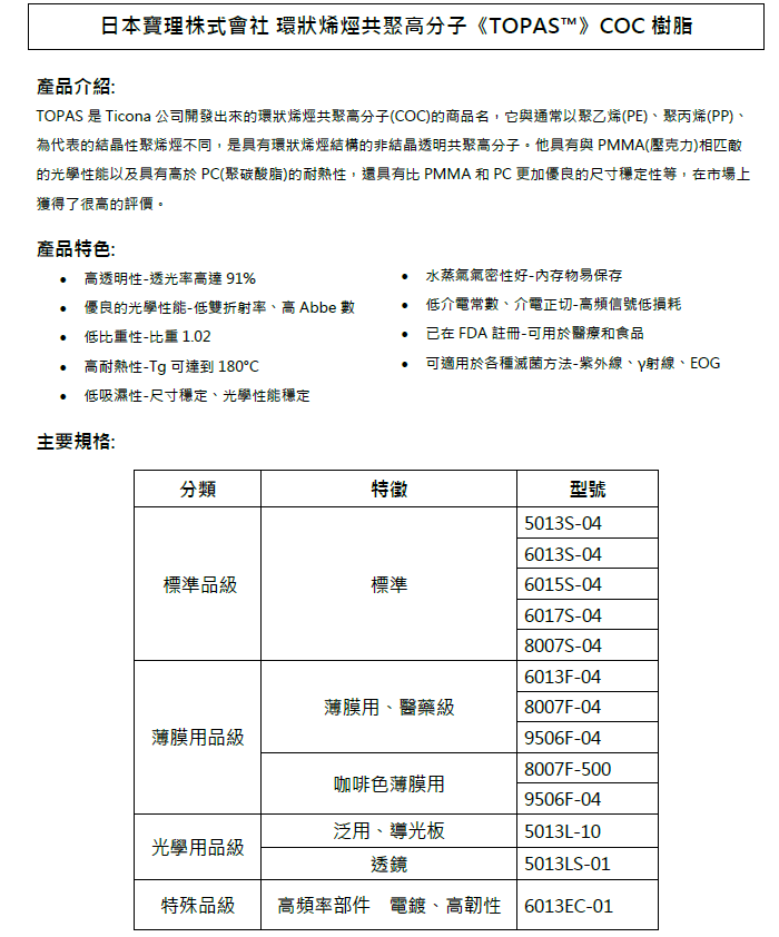 日本寶理TOPAS環狀烯烴共聚高分子COC塑膠原料應用