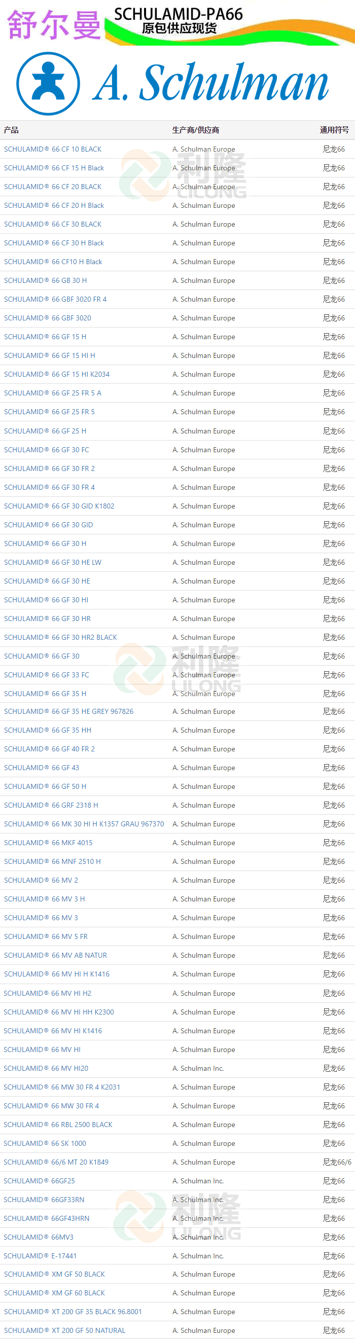 [塑料簡介:]利隆塑料專業經營美國舒爾曼PA66,美國SCHULAMID品牌PA66塑膠原料,想要了解尼龍PA66塑膠原料,舒爾曼PA66原料價格,PA66性能用途,PA66型號和PA66物性的客戶,歡迎來電來函咨詢