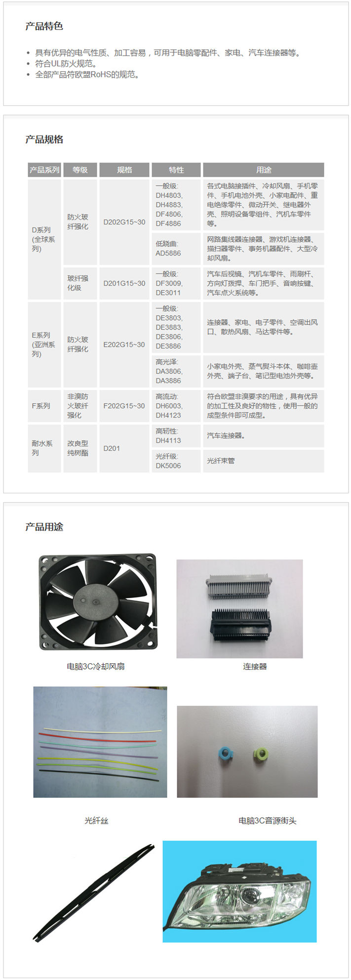 耐水系列: 改良型純樹酯 D201 高軔性: DH4113 汽車連接器。