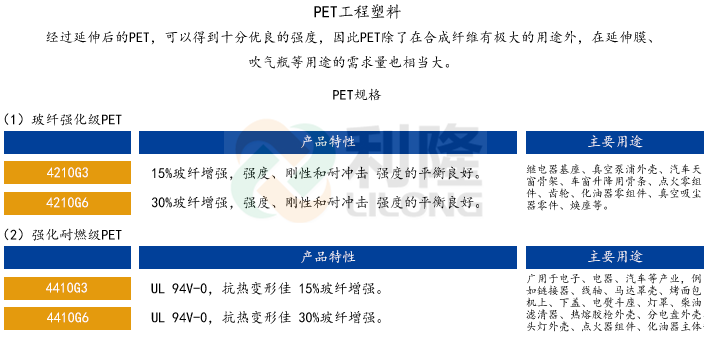 玻璃纖維增強(qiáng)PET適用于電子電氣和汽車行業(yè),用于各種線圈骨架、變壓器、電視機(jī)、錄音機(jī)零部件和外殼、汽車燈座、燈罩、白熱燈座、繼電器、硒整流器等。PET工程塑料目前幾個(gè)應(yīng)用領(lǐng)域的耗用比例為:電器電子26%,汽車22%,機(jī)械19%,用具10%,消費(fèi)品10%,其他為13%。目前PET工程塑料的總消耗量還不大,僅占PET總量的1.6%。