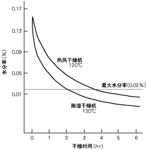 粒料的預(yù)干燥非常重要。預(yù)干燥不充分,成型品會變脆(請參照圖4-1~4-4)。 關(guān)于干燥機,推薦您使用除濕型。 如果干燥后在常溫下放置,粒料就會在短時間內(nèi)因吸收水分而達到平衡水分率。務(wù)請保持溫度,以免吸收水分。 |