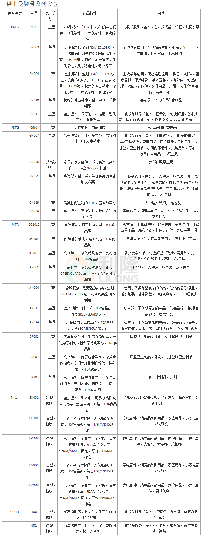 [塑料簡介:]利隆塑料經營國內外品牌POM塑膠原料,PC塑膠原料,PBT塑膠原料,PEI塑膠原料,LCP塑膠原料,PEEK塑膠原料,PPA塑膠原料,PPS塑膠原料,PPSU塑膠原料,PCTG塑膠原料,歡迎廣大客戶來電來函