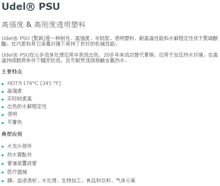 PSU的應用十分廣泛,在電子電氣領域,PSU可用于制作各種接觸器、接插件、變壓器絕緣件、可控硅帽、絕緣套管、線圈骨架、接線柱和集電環等電氣零件,印刷電路板、軸套、罩、TV系統零件、電容器薄膜、電刷座、堿性蓄電池盒等;在汽車、航空領域,PSU可用于制作防護罩 元件、電動齒輪、蓄電池蓋、雷管、電子發火裝置元件、燈具部件、飛機內部配件和飛機外部零件、宇航器外部防護罩等。還可用于PSU制作照明器檔板、電傳動裝置、傳感器等,世界市場上用來制作機艙部件的聚砜類聚合物需求在繼續增長,主要是由于這類聚合物燃燒時釋放的熱量少、產生的煙霧少,有毒氣體擴散量少,完全符合安全規定的使用要求;在廚房用品市場上,PSU可代替玻璃及不銹鋼制品用于制造蒸汽餐盤、咖啡盛器、微波烹調器、牛奶及農產品盛器,蛋炊具及擠奶器部件、飲料和食品分配器等產品。PSU為無毒制品,可制成反復與食品接觸的用具。PSU作為透明新材料,耐熱水、水解穩定性優于其他任何一種熱塑性塑料,故可用于制作咖啡壺等。用PSU制作的連接管,用于玻纖或玻纖增強的聚酯砌面,管外層強度高,管內層耐化學品, 較鋼管輕,且透明,便于臨控,常用于食品工業和制作強光燈的燈盞;在衛生及醫療器械方面, PSU可用于制作外科手術盤、噴霧器、加濕器、接觸透鏡夾具、流量控制器、器械罩、牙科器械、液體容器、起搏器、呼吸器和實驗室器械等。PSU用于制作各種醫療制品較玻璃制品成本低,而且不易破裂,故可用于儀器外殼,齒科儀器,心瓣盒,刀片清理系統,軟接觸鏡片的成型盒,微型過濾器,滲析膜等。PSU還可用于鑲牙,其粘接強度比丙烯酸高一倍;在日用品方面,PSU可用于制作加濕器、吹風機、服裝汽蒸、照相機盒,放映機元器件等耐熱、耐水解產品。經0.4-1.6MGy 輻射和良好干燥過的PSU粒料,在310℃和模溫170℃下很容易注塑成型,適用于層壓材料的粘合劑,所有帶硅烷的聚砜如PSU-SR、PKXR等均可作為粘合劑,用于上漿玻纖和石墨纖維制作復合材料,用石墨織物增強的帶硅烷基的PSU,可制作升降舵等飛機部件。PSU在加上固體潤滑劑聚四氟乙烯后,可增加耐磨性和物理機械性能,也應用于制備耐磨性涂料;除此之外,PSU還可制造各種化工加工設備(如泵外罩、塔外保護層等)、食品加工設備、污染控制設備、奶制品加工設備及工程、建筑、化工用管道等。